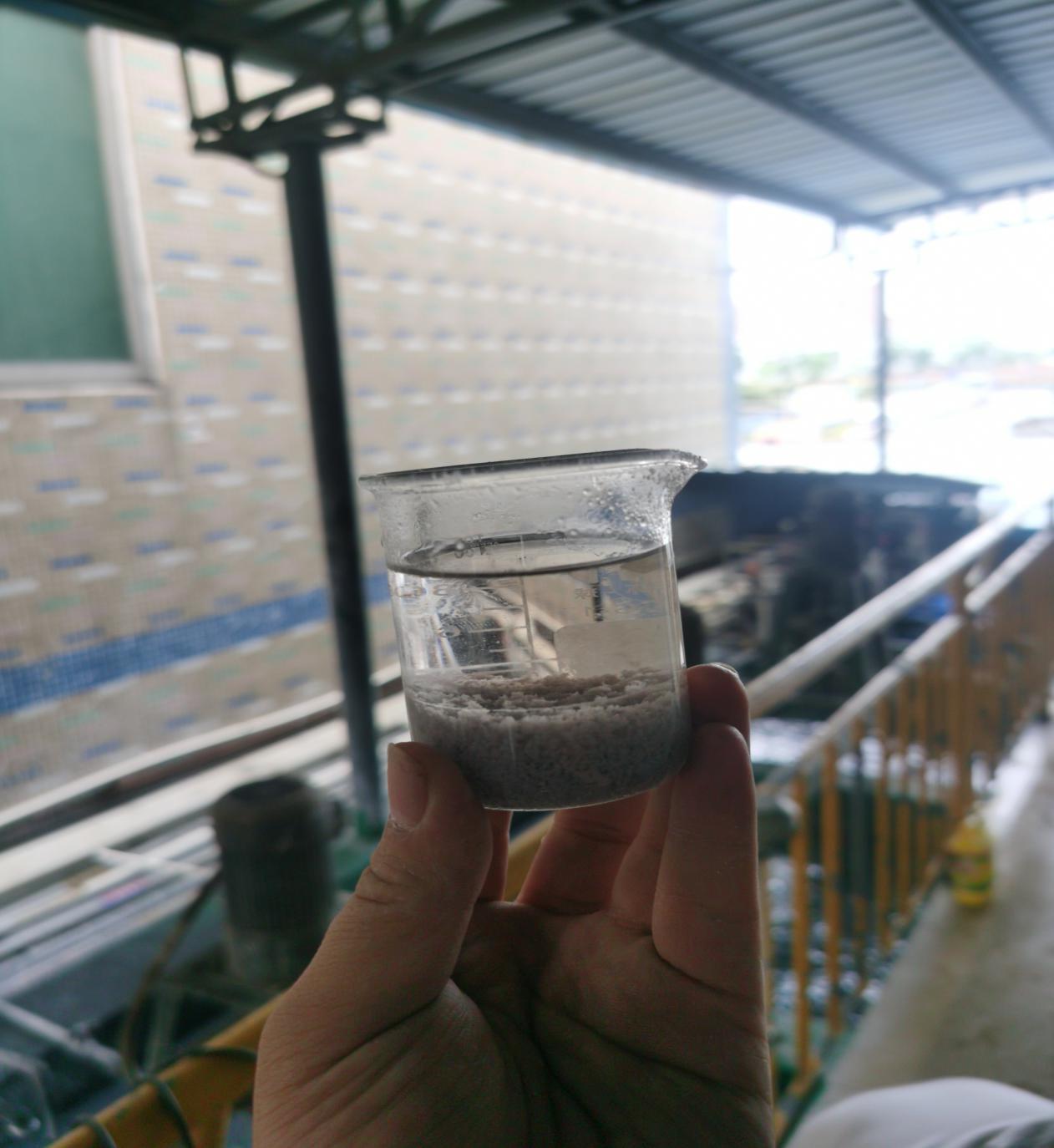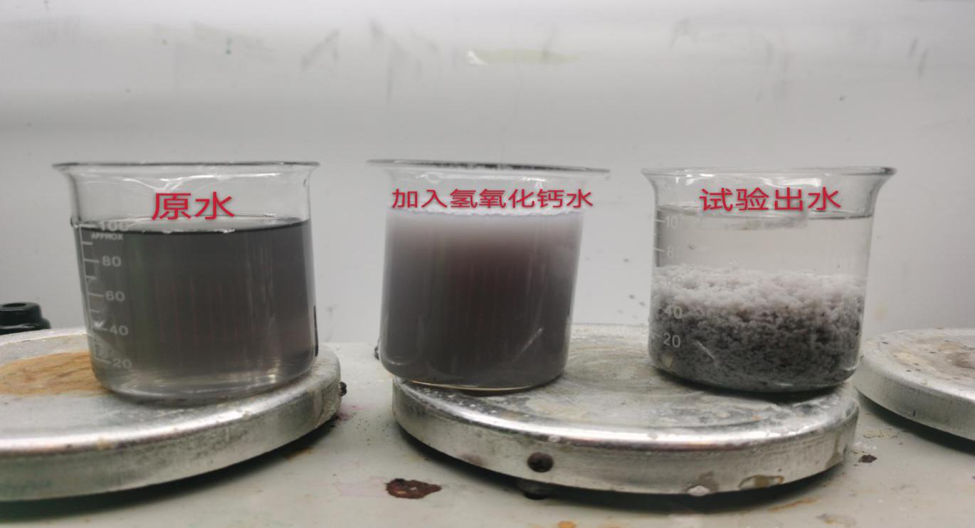 現場取原水測出PH為2.2,總磷為805mg/L。現場前端采用氫氧化鈣調節PH值。我們取了兩部分水,原水用于測數據,調節過PH值的水用于脫色除磷小試。取100ML原水,測出PH值為6.5,直接加入點清脫色劑13號千分之一,攪拌10S,然后加入千分之一的點清除磷劑Ⅰ號攪拌10S,加入1%的聚丙烯酰胺陰離子(千分之一比例稀釋)攪拌沉淀即可,絮凝效果好,上清液水質清澈透底。測出PH值為6.2,總磷為15.6mg/L。
